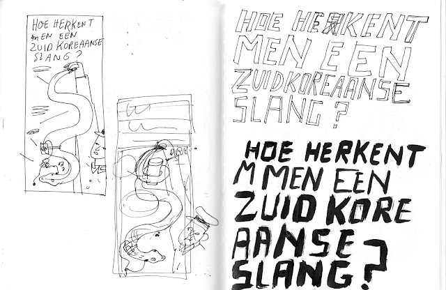 Dat gaat als volgt; kort voor de deadline krijg je een lijstje met actuele onderwerpen aangeleverd (Ik kijk heel weinig nieuws en op deze manier blijf ik nog een beetje op de hoogte, bijkomend voordeel ;)). Een van de nieuwsfeiten vertaal ik naar een illustratie/beeldcollumn. Onderwerpen met een licht absurdistische bijsmaak, of onderwerpen met dieren spreken me altijd bijzonder aan (eigenlijk alles wat niet tè erg dramatisch-de-wereld-gaat-er-aan is. Ja, ik leef graag in een bubbel). Dit maal werd ik op mijn wenken bediend want ‘Zuid Korea bestookt noord Korea met propaganda en Slangen’. omg.